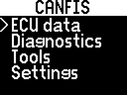 Main menu ECU Data - view the configured sets of measurementsDiagnostics - connect to a control module for diagnosisTools - access one of the included toolsSettings - view or change settings