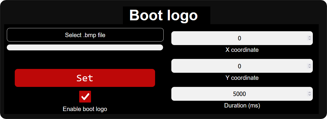 - - wgraj wybrane logo startowe z jego ustawieniami