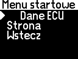 Menu startowe Tutaj możesz zmienić, na której stronie ma się rozpoczynać działanie po włączeniu zapłonu. Możesz wybrać rozpoczęcie na Menu główne lub na Dane ECU. StronaJeśli wybierzesz Dane ECU, możesz również zmienić, od której strony ma się rozpoczynać.Menu główne / Brak pliku konfiguracyjnegoJeśli wybierzesz Menu główne, albo wybierzesz Dane ECU, ale plik konfiguracyjny nie jest zainstalowany, strona nie może być zmieniona. Menu - wybierz, na którym menu zacząć Strona - wybierz, na której stronie danych ECU zacząć Wstecz - powrót do Ustawienia